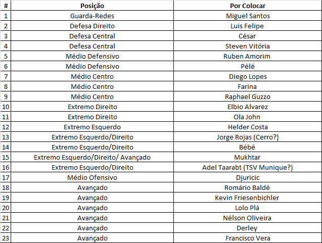 - O Plantel Principal está praticamente fechado. Na minha opinião falta acrescentar um 8 com provas dadas e decidir quais os 6/8 jogadores que não farão parte da operação Tetra. Podem ir pensando quem riscariam, garanto-vos que será uma boa dor de cabeça para Rui Vitória.
